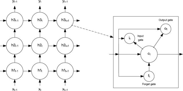 记忆单元包含了能够控制信息流入或者流出该单元的一些门。输入门(input gate)控制什么时候新的信息可以流入记忆单元。遗忘门(forget gate)控制一段信息在记忆单元中存留的时间。最后,输出门(output gate)控制输出何时使用记忆单元中包含的信息。记忆单元还包括控制每一个门的权重。训练算法(通常是通过时间的反向传播(backpropagation-through-time),反向传播算法的一种变体)基于所得到的误差来优化这些权重。