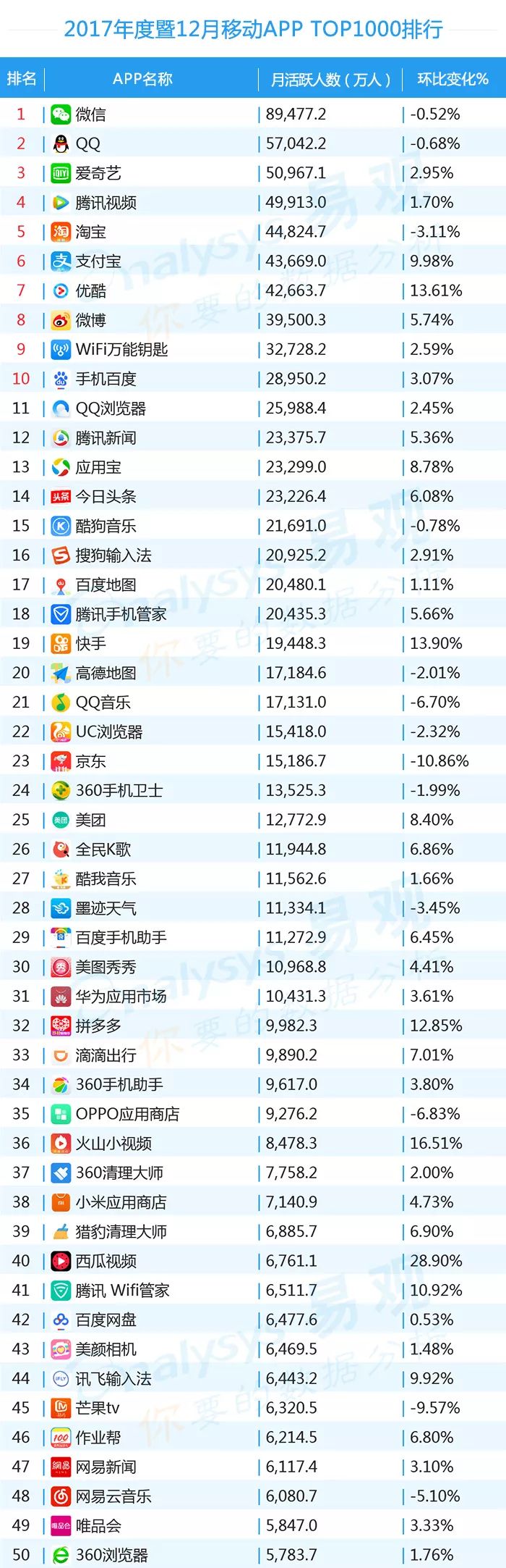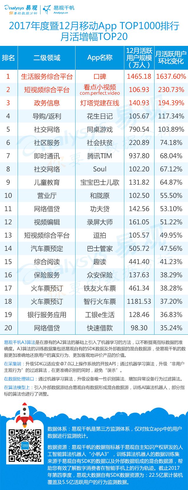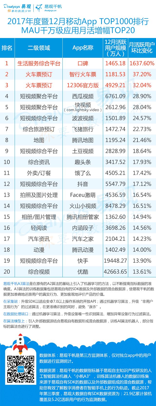 根据易观丰富的移动互联网数据资源储备及大数据分析技术及产品,我们根据易观千帆2017年12月数据,特别制作了《中国移动互联网 2017年度暨12月TOP1000榜单》,并由易观各行业资深分析师进行分析解读。
