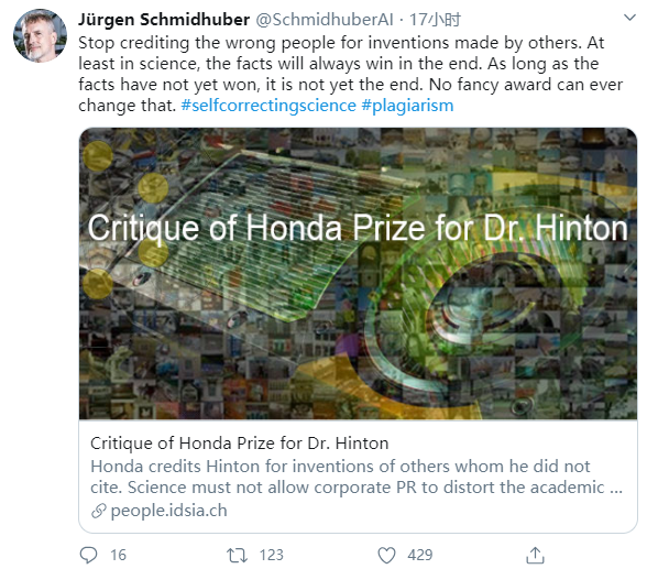 Jürgen Schmidhuber 在推特上表示:「不要弄错新技术的发明者。至少在科学领域中,真相终将显现。真相没有显现,只能说明时候未到。奖项无法改变事实。」