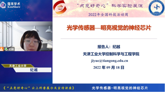 2022年9月18日,天津工业大学控制科学与工程学院纪越副教授面向全国观众开展了“光学传感器-明亮视觉的神经芯片”的科普讲座。纪越老师曾经获得天津市第十五届高校青年教师教学基本功竞赛一等奖,她将科技领域深奥难懂的器件-光学传感器,以通俗易懂的方式向公众进行展示和宣传,并介绍了在日常生活中的应用现状,提升公众对高科技的理解和认知,激发科技梦想。