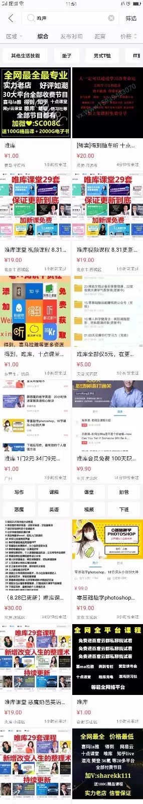 这个寻找过程是如此容易,无论是以淘宝、闲鱼、转转为代表的电商体系,以58同城为代表的信息发布体系,还是各种社交平台,只要搜索“得到”、“喜马拉雅”、“摩尔金融”等关键字,都可以看到几十甚至上百页相关商品,在购买或者私信后,用户就会被拉到各类社交群里,最终的下载路径往往是百度云盘,内容为付费平台不断更新的全年内容,而价格往往仅有几十元,为平台直接购买的十分之一甚至百分之一。