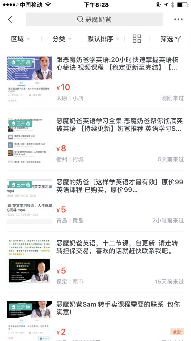 在淘宝、闲鱼、转转上关于知识付费的店铺更是无处不在,以近日知名的大V恶魔奶爸为例,在这三个平台上都不乏案例。而据腾讯科技了解,恶魔奶爸并未授权以上任何平台销售相关产品。