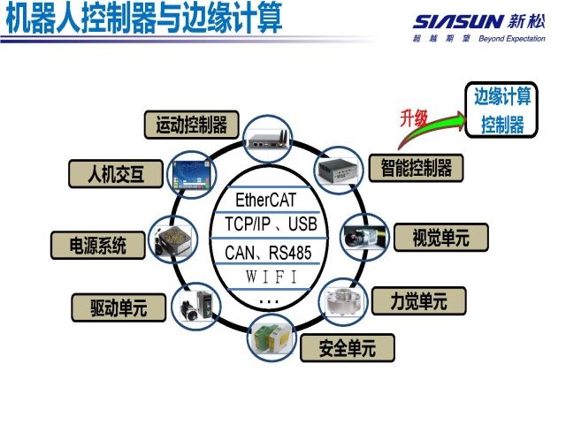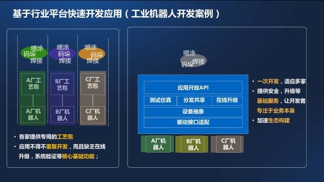目前的机器人控制器,既包括运动规划和控制功能,也包括具体行业应用功能。在应用上存在以下两点制约:一是行业类应用与机器人的基础控制耦合程度深,不利于应用功能的开发、升级和转换;二是机器人控制器的接口能力和计算能力有限,对PLC/传感器/智能仪表/智能IO等周边设备接入和控制的支持差。