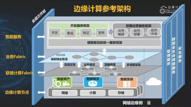 从图5中,我们可以看到边缘计算产业联盟对于边缘计算的参考架构的定义,包含了设备、网络、数据与应用四域,主要提供在网络互联(包括总线)、计算能力、数据存储与应用方面的软硬件基础设施。
