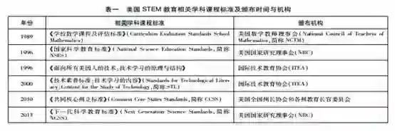 20世纪80年代以来,美国兴起了声势浩大的基于课程标准的教育改革运动,试图通过课程标准提升教育质量。课程标准明确说明学科的主要概念与原则、核心知识内容、主要过程与基本技能,提供共同的学习目标、学习内容和评价依据。因此,在STEM整合教育中,标准也受到了极大关注。相关学科部分课程标准见表一。2010年,《共同核心州立标准》(CCSS)正式颁布,它和《共同核心州立英语艺术与历史/社会、科学、技术学科中的读写标准》都要求与STEM学科建立更多更深的联系。2013年,《下一代科学教育标准》(NGSS)明确包含工程和科学的核心理念及实践知识,并希望科学教师以整合的方式教授科学和工程知识。
