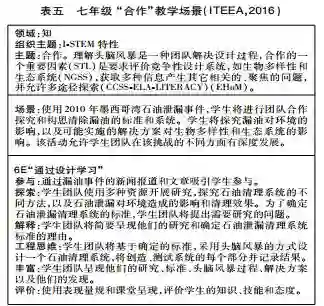 为了帮助课程开发者、学校、教师使用I-STEM模式,该模式为每个主题提供一个教学场景,展示基于核心概念的教学过程。每个教学场景包括简短的描述,简要的“通过设计学习”(6E Learning by Design)6E步骤,包括参与、探索、解释、工程思维、丰富、评价。为了使用方便,教学场景也给出主题所属的领域和组织主题,以及供对照的标准。以7年级“合作”主题为例(见表五),该教学场景选取了2010年墨西哥湾石油泄漏事件为情境,明确活动的目的和过程,并呈现了采用6E教学模式,结合具体情境的问题解决展开教与学。