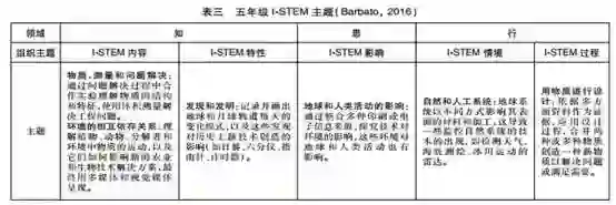 知、思、行的领域划分,与传统关注知识和行为的课程设计相比,增加了思维的维度,凸显了思维的地位。在组织主题方面,“I-STEM内容”从独立学科角度呈现,“I-STEM特性”从整合的角度呈现;“I-STEM影响”关注科学、技术、工程与自然、社会的相互关系;“I-STEM情境”反映了STEM相关学科尤其是技术与工程面向真实世界,具有应用性、实践性的特点;“I-STEM过程”从实践角度反映各学科本质。