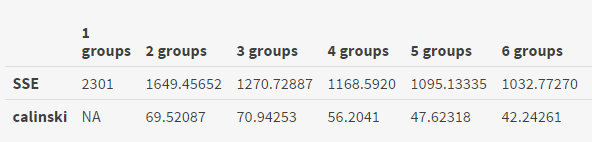 可以看到该函数把组内平方和误差和Calinsky都计算出来了,可以看到calinski在聚类数为3时达到较大值。