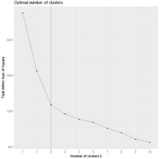 随着聚类数目增多,每一个类别中数量越来越少,距离越来越近,因此WSS值肯定是随着聚类数目增多而减少的,所以关注的是斜率的变化,但WWS减少得很缓慢时,就认为进一步增大聚类数效果也并不能增强,存在得这个“肘点”就是较佳聚类数目,从一类到三类下降得很快,之后下降得很慢,所以较佳聚类个数选为三