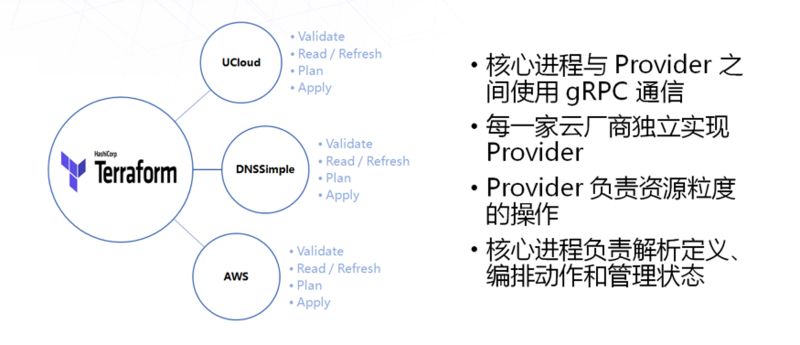 Terraform 使用插件(Plugin = Provider + Provisioner)来抽象出各个云厂商之间的差异,并相互隔离。