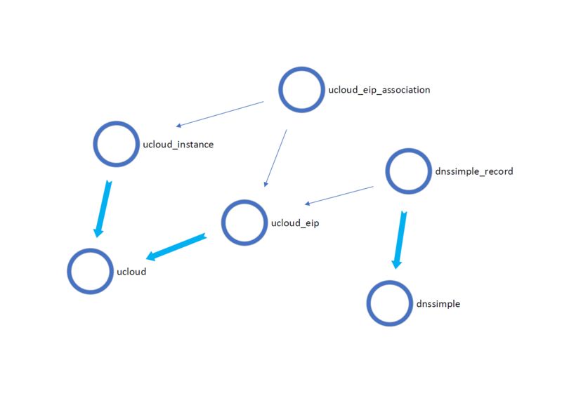 • 一种是抽象为边,将两个资源节点连接在一起,例如从 dnssimple_record 到 ucloud_eip 的箭头表示将 DNS 指向弹性 IP(eip);
