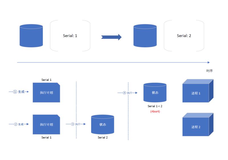 进程 P1 和 P2 依次读到了序号为 1 的数据,并且都想进行写操作,P1 先修改数据,自增序号为 2 并写入成功,此时 P2 进行写操作时,由于修改后的序号同样为 2,此时应抛出写失败,P2 需要主动重新读取最新的数据再次修改,才能成功写入。