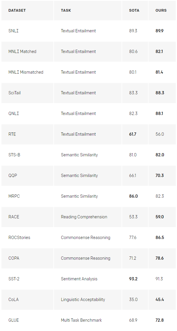 值得一提的是该方法在三种关于测试常识推理和阅读理解的数据集(COPA,RACE和ROCStories)上的表现。我们的模型以远超第二名的成绩在这些数据集上获得了最先进的结果。这些数据集普遍被认为需要借助多语句推理和有意义的世界知识进行解决,而我们的模型主要通过无监督学习来提高这些技能。这也表明了通过无监督技术来开发复杂的语言理解功能的可能。这让我们特别兴奋。