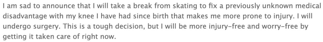 这时他才知道,自己的膝盖由于先天的缺陷,要比别人要更容易受伤。想要继续滑冰,就必须接受相关的手术。