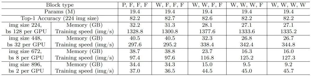 然而,引入这样的窗口注意力机制会制约Vision Transformer模型对长距离信息的建模能力。为此,我们探索了在不同阶段使用窗口注意力机制对模型表现和计算代价的影响,结果如表2所示。在表2中,P代表使用performer进行注意力计算,F表示使用全注意力机制,W表示使用窗口注意力机制。我们发现,在前两个阶段使用窗口注意力机制,后两个阶段使用全注意力机制可以取得性能和计算代价的最佳权衡。因此,我们采用了“WWFF”的方式对ViTAEv2模型进行了设计。此外,需要注意的是,ViTAEv2模型并不需要Swin Transformer中采用的额外相对位置编码和窗口移动(window shift)机制即可得到较好的效果,这归功于ViTAE模型中卷积模块已经能够提供位置信息并促进跨窗信息融合。对相对位置编码和窗口移动机制的消融实验结果如表3所示。