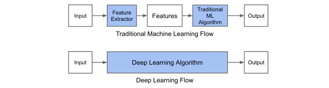 下图展示了特征提取(使用传统的计算机视觉技术)和端到端学习二者之间的差异: