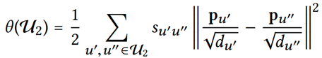 平滑约束(smoothness constrain):定义了结构一致性损失,希望相邻的用户的表示相似;su',u'' 是两个用户社交关系的强度,du' 是节点 u' 的出度,称为平滑约束是因为为每个用户的特征表示除以了出度的开方,进行了平滑,如果没有这个处理,那么社交关系多的活跃用户将会产生更有效的传播。