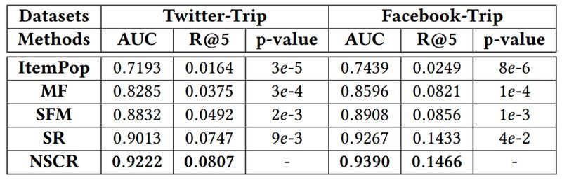 信息域数据集来自 trip.com,同时找到其中一些用户相关的 Facebook 和 Twitter 信息。评估指标为个性化排序的指标 AUC 和 Recall@k。