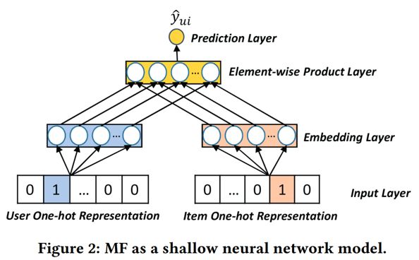 矩阵分解模型(MF)是推荐系统重要的一个模型,这里先引入一个观点,即 CF 模型可以看做是一个浅层神经网络模型。