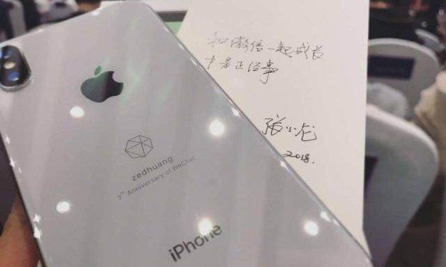 腾讯微信团队有年会发iPhone的惯例,人手一台:2015年iPhone6s,2016年iPhone7plus,而2018年则是iPhone X(256GB白色顶配版,手机背面激光雕刻微信7周年图案、字样与员工名字),而且配有“微信之父”张小龙的手写卡片:“和微信一起成长才是正经事”。