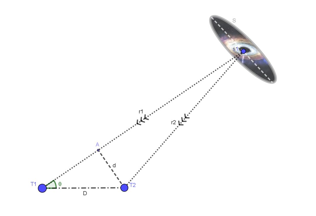 下图中,S为信号源,它的不同处以不同的强度向空间发出信号。T1 与 T2 为两个信号接收装置,两者的距离为D。这两个信号接收器收到的是S各处发出的信号的总和。我们的任务是找出收到的信号与S上信号分布的关系而生成 S的“图像”(也就是S上各处信号强度变化图)。数学分析的基本线路是,先找出S上任意一点在两个接收器产生的信号,然后把S上各点的信号加起来(又称积分)。下面虽然图像是一个黑洞假想照,但是相关分析适用于其他应用。