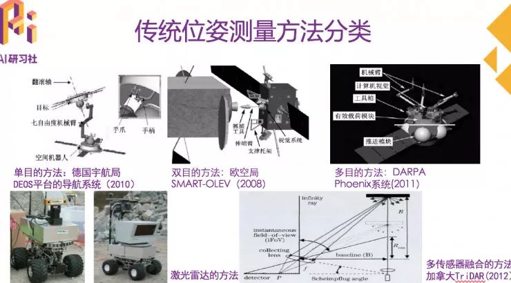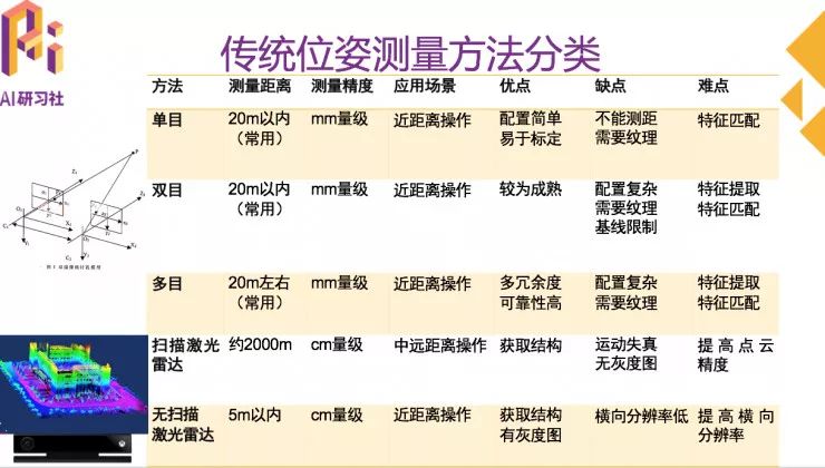 传统的位姿测量方法主要包括基于单目的方法,基于双目的方法,基于多目的方法,基于扫描式激光雷达的方法,基于非扫描式激光雷达的方法,近年来发展迅速的基于SLAM的方法,以及多传感器融合的方法。