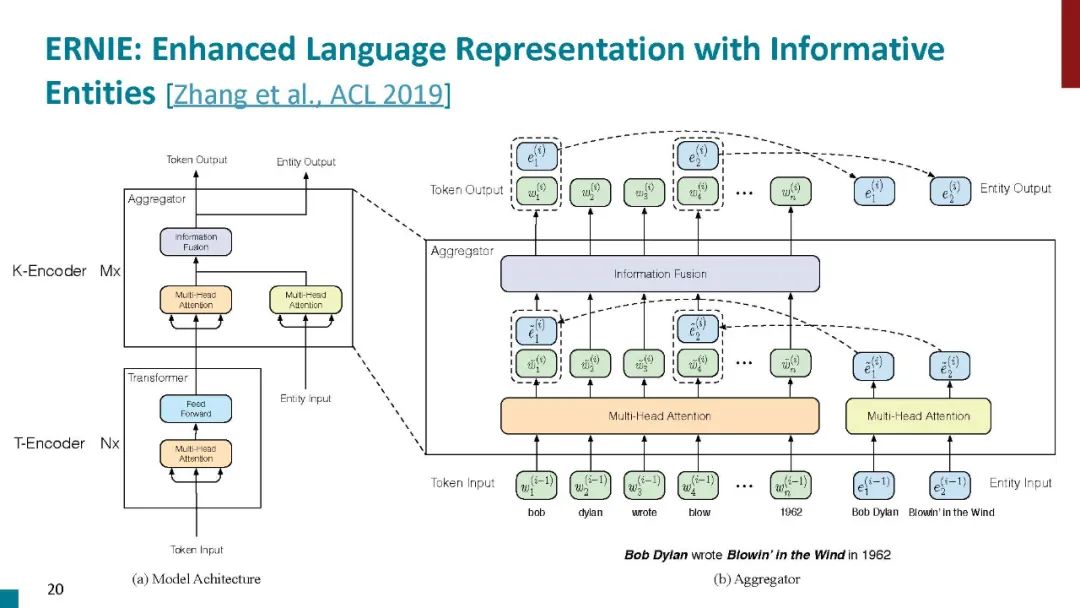 以ELMO (Peters et al., 2018)、GPT (Radford et al., 2018)和BERT (Devlin et al., 2019)为代表的预训练语言模型受到了广泛关注,并提出了大量的变体模型。在这些研究中,一些研究人员致力于将知识引入语言模型(Levine et al., 2019; Lauscher et al., 2019; Liu et al., 2019; Zhang et al., 2019b)。ERNIE-Baidu (Sun et al., 2019)引入新的掩蔽单元,如短语和实体,在这些掩蔽单元中学习知识信息。作为奖励,来自短语和实体的语法和语义信息被隐式地集成到语言模型中。此外,ERNIE-Tsinghua (Zhang et al., 2019a)探索了一种不同的知识信息,将知识图谱整合到BERT中,同时学习词汇、句法和知识信息。Xiong et al. (2019) 将实体替换检查任务引入到预先训练的语言模型中,并改进若干与实体相关的下游任务,如问答和实体类型。Wang et al.(2020)提出了一种将知识注入语言模型的插件方式,他们的方法将不同种类的知识保存在不同的适配器中。这些方法所引入的知识信息并没有很重视KG中图表化的知识。