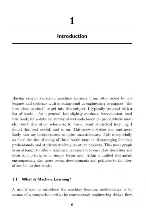 当我在教授机器学习课程时,有着工程学背景的同事和学生经常问及:如何更好地入门机器学习。我通常会以书籍推荐的形式回应——一般但稍微过时的介绍,请读这本书;对于基于概率模型方法的详细调查,请查看这些索引;如果想要了解统计学习,我觉得这篇文章很有用;如此等等。结果证明这些回答无法使我与提问者满意。书籍很多很厚,使得繁忙的工程学教授和学生望而却步。因此我首次撰写了这篇专论,一篇基础且体量适当的入门书,其中通过简单的术语面向工程师统一介绍了机器学习主要思想和原理,同时涵盖了其最新发展和文献指导,以供进一步研究。