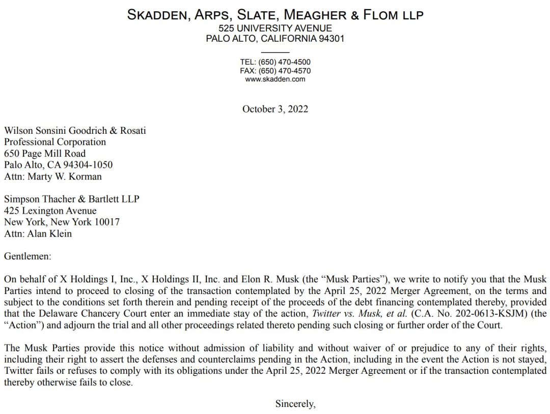 我们代表 X Holdings I, Inc.、X Holdings II, Inc. 和 Elon R. Musk(“Musk 方”)致函通知你,Musk 方打算按照 2022 年 4 月 25 日合并协议中的条款和条件,等收到债务融资收益后,继续着手完成交易,条件是特拉华州大法官法院立即中止推特 vs. Musk 等人的诉讼(以下简称 “诉讼”),并暂停审判和与之相关的所有其他程序,以待法院的结束或进一步命令。