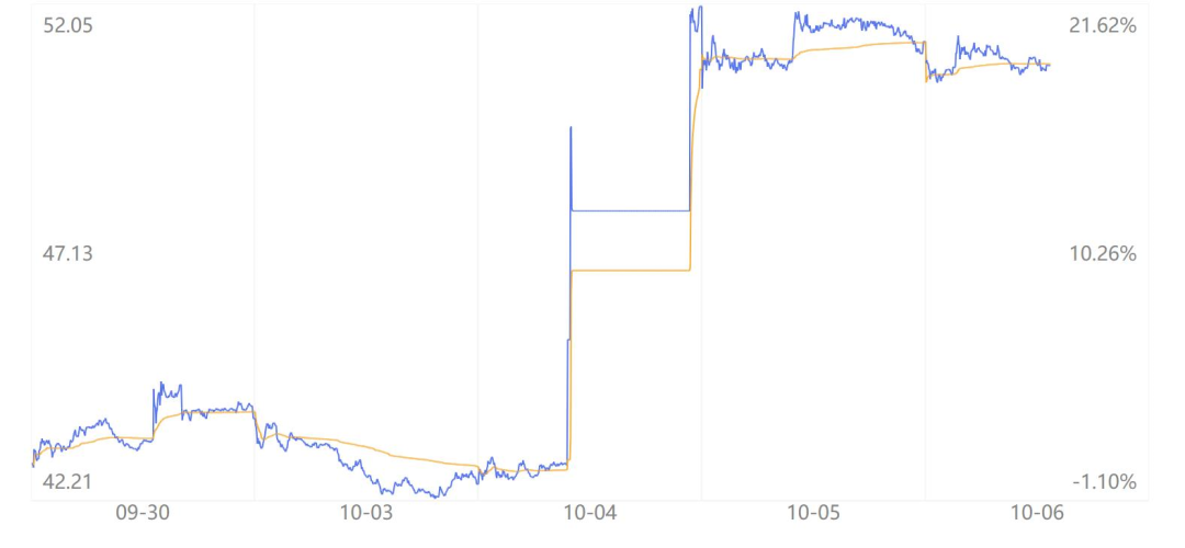 前两天,推特的美股大涨,从周一的 42.54 美元/股,到周二收盘时就涨至 52 美元/股,涨幅高达 22.24%——这一反常现象的背后,果然又是马斯克的“功劳”(注:上一次推特股价突然大涨,还是今年 4 月马斯克宣布要收购推特)。