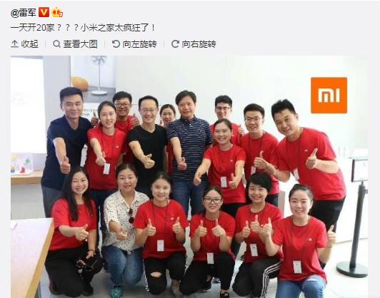 雷军:今年10月1日,雷军忙着在全国各地开线下店,前段时间,雷军还在微博上表示:“一天开20家???小米之家太疯狂了!”