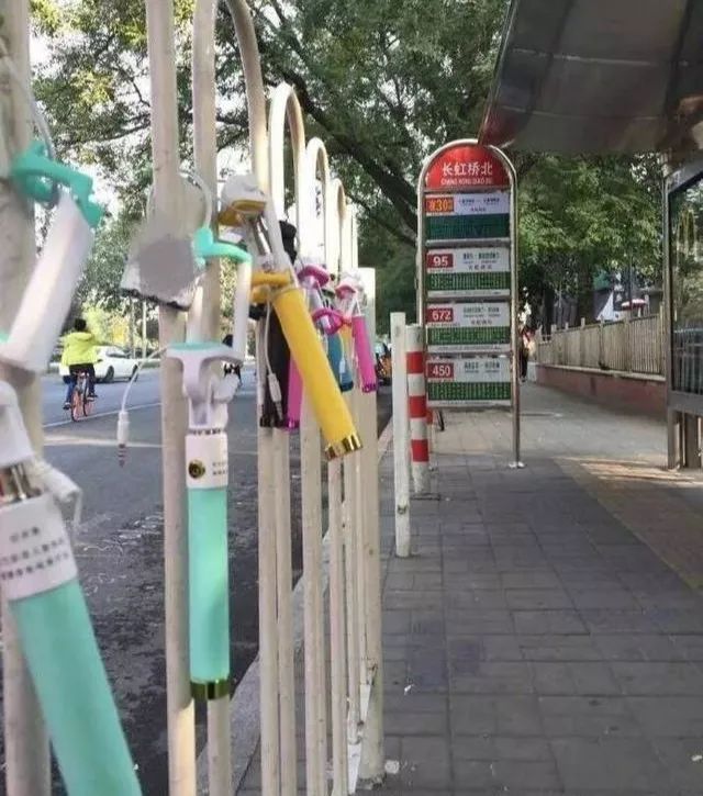 北京长虹桥公交站近日出现一批共享自拍杆,,从图中可以看出,这些栓在路边护栏上的自拍杆,只要扫码就可以使用,和之前出现的共享马扎类似的是,这些自拍杆都被锁死在栏杆上,并不能随意取走。
