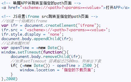 URI Scheme 是iOS,Android平台都支持,只需要原生APP开发时注册 scheme , 用户点击到此类链接时,会自动唤醒APP,借助于 URL Router 机制,则还可以跳转至指定页面。