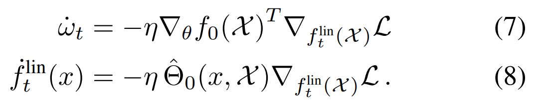 其中 ω_t ≡ θ_t − θ_0 表示模型参数从初始值到终值的变化。表达式 (6) 左边的 f_t 为两项之和:第一项为网络的初始化输出,根据泰勒公式,它在训练过程中是不改变的;第二项则会捕捉初始值在训练过程中的变化。如果我们使用线性函数,那么梯度流的动态过程可以表示为: