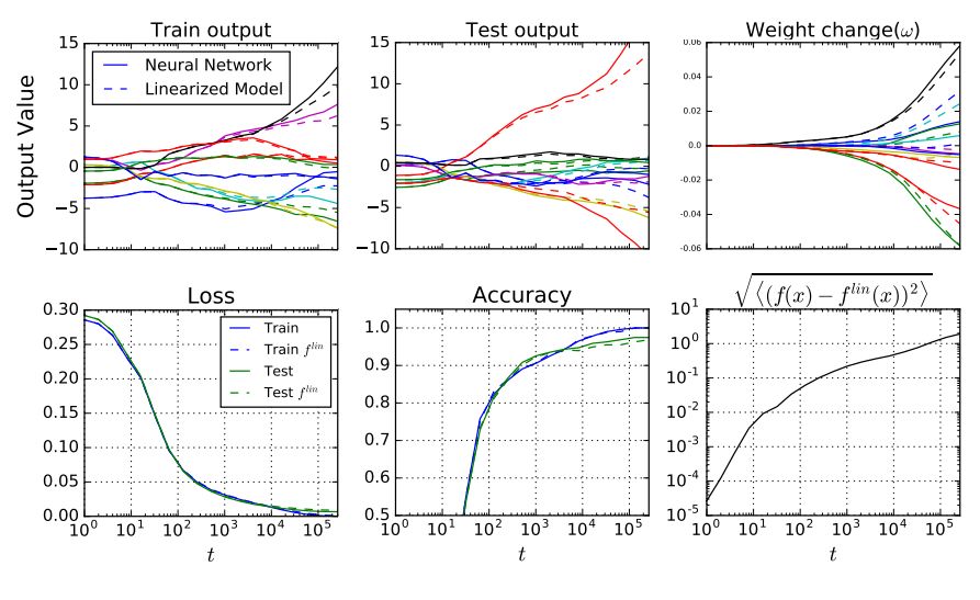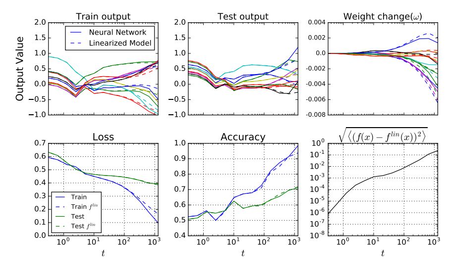 因此,尽管没有训练该网络,我们同样能获得线性化神经网络沿时间的演化过程。我们只需要计算正切核函数 Θ_0 hat 和初始状态的输出 f_0,并根据方程 11、12 和 9 计算模型输出和权重的动态变化过程。重要的是,这样计算出来的值竟然和对应非线性深度网络迭代学习出来的值非常相似。