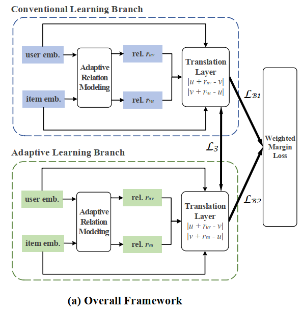 本文来自武汉大学和香港理工大学,提出了一个考虑了领域级多样性的双分支网络用于产生多样化推荐。其考虑了在不同领域数据集上用户对于多样化内容的需求程度不同,首先统计数据集整体的偏好分布,整体偏好分布的集中度用于决定两个模型分支各自所占的比例。两个分支都采用距离模型来建模交互数据,不同在于采样时类别的权重互为倒数,同时用户的历史交互在类别上的分布也被编码为向量加入到关系中。其在模型上将准确性目标和多样性目标放在两个分支中,通过平衡权重来达到多样性的推荐。