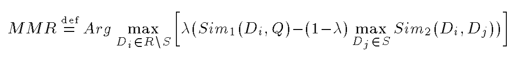 MMR算法最早在SIGIR1998上面被用户搜索领域,其从所有候选文档中逐个选择文档放入结果列表中,选择文档是同时考虑了文档与搜索内容的匹配程度和此文档与结果列表中其他文档之间的最大相似度。具体来说,其将文档与搜索的相关性与文档之间的相似性以一定的权重相减作为目标函数,每次贪心的选择目标函数值最大的文档加入结果中,以实现在搜索结果中增加多样性的目的。