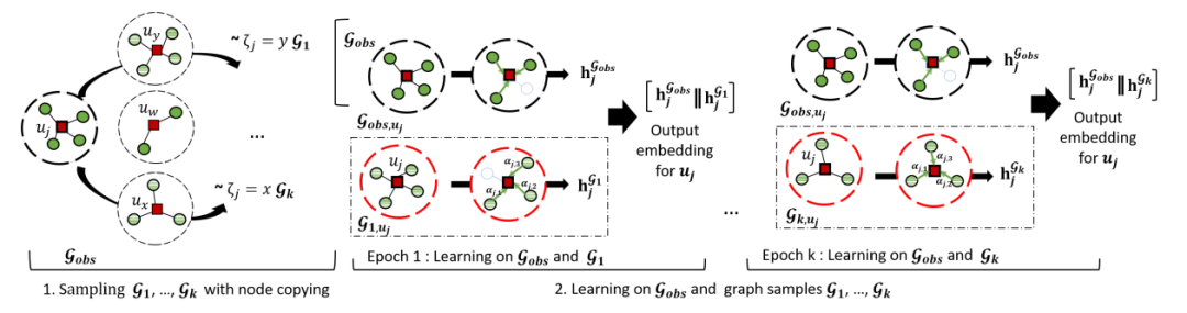 这篇文章来自华为诺亚方舟实验室,其提出了一种使用节点复制的贝叶斯图神经网络(BGCN)。在这个模型中初始的U-I交互二部图上的节点根据其邻居集合的重叠度进行了重新的映射,得到了一个新的采样图,最终使用采样图与原图上分别使用GAT模型进行消息传播,得到的输出合并用于推荐。这种方法本质上可以看作一种图数据增广的策略,即对图的邻接矩阵进行一定程度的扰动,其定义的数据增广方式为每个用户节点的邻居可能被替换为与其行为相似的其他用户节点的邻居,通过增加数据层面的不确定性来提高模型的承载力,防止对用户兴趣建模的极端化。