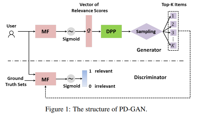 本文来自于阿里-南洋理工大学团队,提出了一种基于DPP的生成对抗网路模型用于多样化推荐。其在模型层面将负责准确性和多样性的模型分开,分别作为生成器和判别器,在生成器中首先使用矩阵分解模型(MF)来建模用户的偏好和商品之间的相似度,再将得到的向量构建为核矩阵输入到DPP模型中,使得DPP模型的输出尽量满足多样性,再将推荐结果列表交给判别器。判别器同样使用一个MF模型训练,其对得到的推荐列表进行打分,让结果的准确性尽量高,通过平衡两个目标实现多样化的推荐。其将双目标平衡与生成对抗模型相结合的思路十分巧妙。