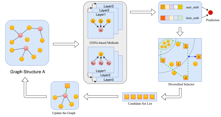 本文来自于美团,提出了一种动态图构建的方法用于提高推荐多样性。现有的基于GNN的推荐模型大都采样一阶邻居聚合的方法进行端到端的训练,但是这种GNN结构会使得占据主导地位的节点特征淹没长尾节点的特征。为了解决这个问题,其将端到端的训练过程进行多轮迭代,每一次都为图结构增加一些新的边,以此希望能够缓解邻居聚合时的特征分布偏差。在添加新边时,为每一个用户节点贪心的选择新的邻居商品集合,在选择时同时考虑了商品与用户的匹配程度和商品与已有邻居之间的距离,力求新加入的商品尽量多样。其本质上还是通过发掘潜在的多样交互以丰富用户数据。
