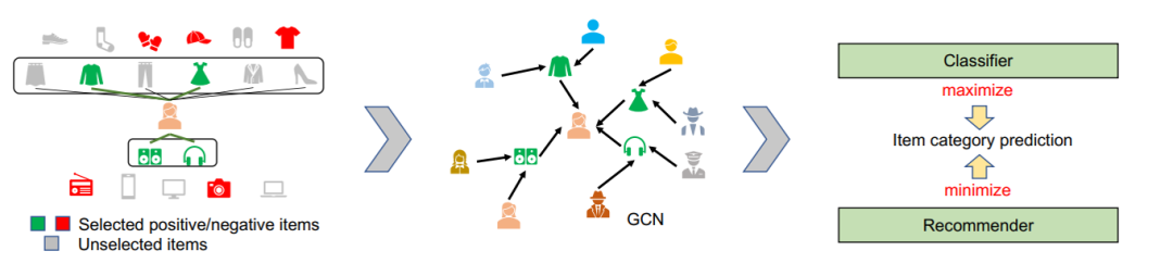 本文来自清华大学,提出了一个图卷积网络用于多样化推荐。其首先分析在图模型中如果使用所有的用户交互聚合得到用户特征,则用户特征会带有明显的类别属性,导致推荐偏向其交互更多的类别,为了消除这种类别带来的偏差,其提出了三个训练策略:1.使用一个训练任务进行对抗训练,最小化商品特征向量与其对应的类别标签之间的联系。2.图卷积时对邻居进行采样,采样的权重由所有的邻居商品的类别分布决定,以平衡不同类别下的邻居数量。3.根据类别进行负采样,按照一定比例选择随机采样或采样同一类别采样可以平衡准确性和多样性。本文是在GNN的框架下提出了一种较为通用的采样策略以提高类别多样性。