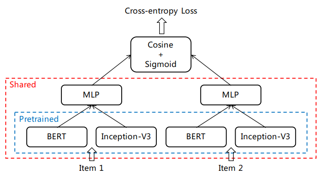 这其中比较关键的一步便是得到商品的嵌入向量,这里其综合了基于内容和基于协同的模型,提出了一种融合的CB2CF模型,将文本、图片和商品间的共现关系一并编码到向量中。
