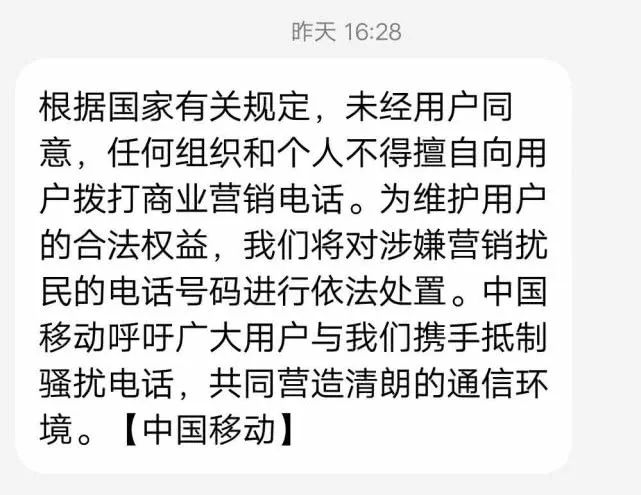 近日,部分移动用户收到了中国移动的一条群发短信称,根据国家有关规定,未经用户同意,任何组织和个人不得擅自向用户拨打商业营销电话。为维护用户的合法权益,我们将对涉嫌营销扰民的电话号码进行依法处置。中国移动呼吁广大用户与我们携手抵制骚扰电话,共同营造清朗的通信环境。(澎湃新闻)