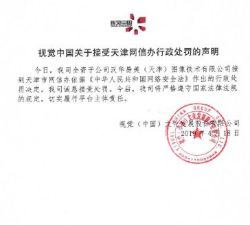 4月18日,天津市网信办依法对视觉中国网站做出行政处罚。经查,视觉中国网站(域名:vcg.com)在其发布的多张图片中刊发敏感有害信息标注,违反了《中华人民共和国网络安全法》第四十七条之规定。天津市网信办依据《中华人民共和国网络安全法》第六十八条第一款之规定,对网站运营主体汉华易美(天津)图像技术有限公司作出从重罚款的处罚。监管部门并未披露罚款的具体内容。