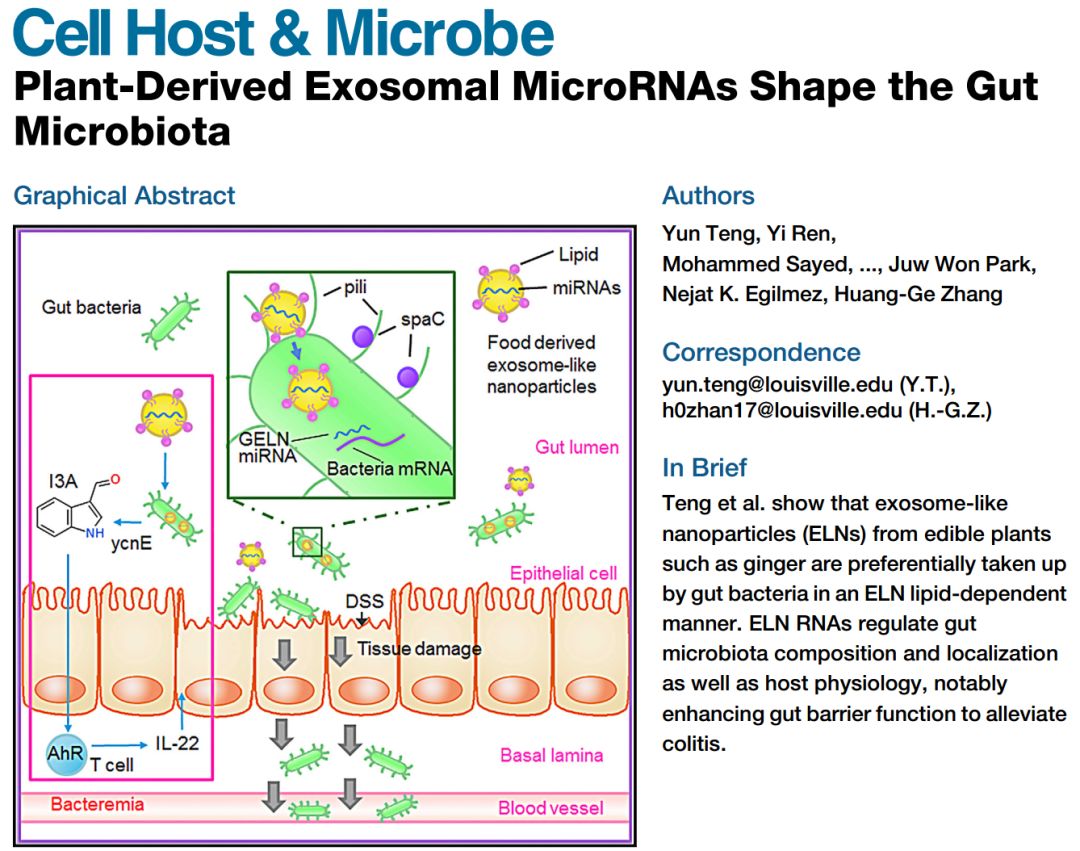 TENG Y, REN Y, SAYED M, et al. Plant-Derived Exosomal MicroRNAs Shape the Gut Microbiota[J]. Cell Host & Microbe.DOI:https://doi.org/10.1016/j.chom.2018.10.001
