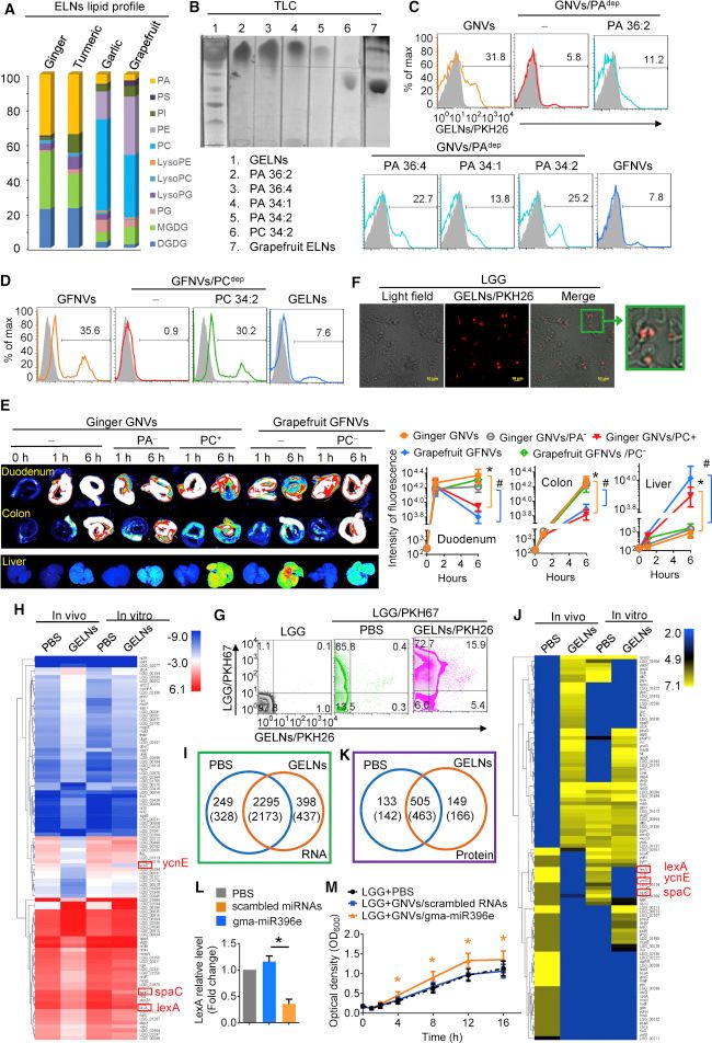 该研究通过匀浆、过滤、多步差速法等步骤从夏威夷生姜根、胡萝卜、大蒜、姜黄根和葡萄柚中提取外泌体样纳米颗粒。后四者为对照。首先发现姜外泌体样纳米颗粒(GELNs)影响肠道微生物群。GELNs可以调节乳杆菌代谢物,所以研究人员选择乳杆菌进一步分析GELN介导的乳杆菌生物学效应的分子机制。姜外泌体样纳米颗粒(GELNs)优先被肠道细菌吸收,导致细菌的组成、定位以及宿主生理学发生变化。富含磷脂酸(PA)的GELNs向鼠李糖乳杆菌(LGG)发送信号,导致优先摄取GELNs。GELNs被肠道细菌选择性摄取后调节乳杆菌mRNA和蛋白质的表达。一旦GELNs被乳杆菌吸收,GELN-RNAs与一组乳杆菌基因相互作用,改变肠道菌群的组成。同时,GELN-RNA处理的乳杆菌释放的代谢物反过来调节其他肠道细菌的生长。