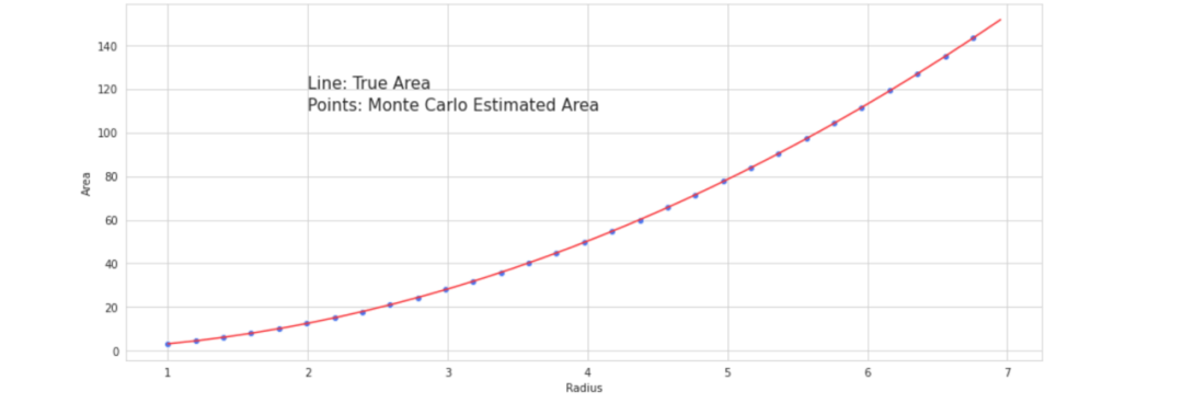 当然,计算圆面积的公式很好记就是𝜋r²。无需使用微积分中的任何复杂的数学方法或其他证明,我们就能找到它的公式,并找到一种使用蒙特卡洛模拟和二次回归找到𝜋值的方法。使用这种思路就可以找到计算圆面积的方法——当然也可以找到任何图形的面积计算公式——椭圆、心形、二维的乌龟形状——只要参数可以说明它的轮廓。