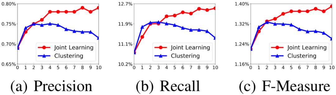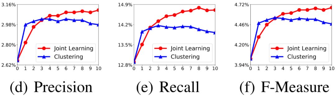 从实验结果中可以发现,本文提出的 JTM 方案,在树结构学习的逐步迭代过程中,能够稳定地收敛到一个更优的树结构。与之对比的是,基于聚类的方案,在迭代最后都会出现类似于过拟合的情况。