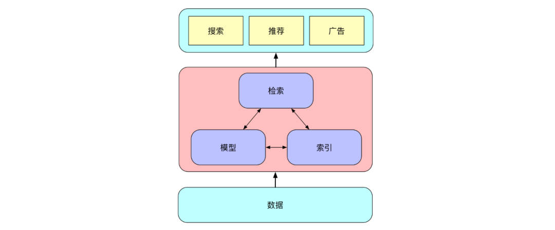 如下图所示,在大规模任务中,搜索,推荐和广告的系统通常由模型,索引和检索算法三大组件组成。模型计算单个用户-商品的偏好概率,索引将所有商品有序地组织在一起,检索算法根据模型的输出在索引中召回最终的推荐结果。三者共同决定了召回质量且存在内在联系。