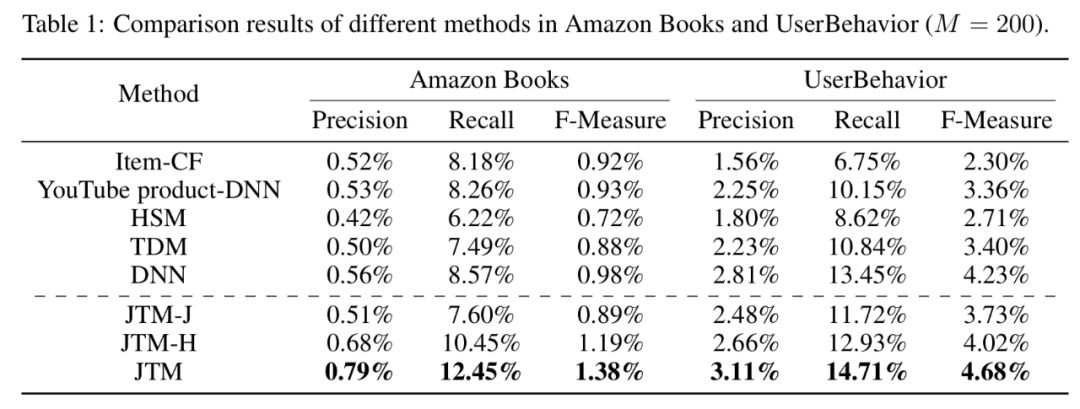 JTM: 本文中提出的联合优化方法。同时,我们对比了 JTM 的两个变种版本,分别为 JTM-J 和 JTM-H。其中,JTM-J 为使用了树结构联合优化但没有采用层次化用户兴趣表达的版本;JTM-H 相反,其使用了层次化用户兴趣表达,但会使用固定的初始树结构而不进行联合学习。